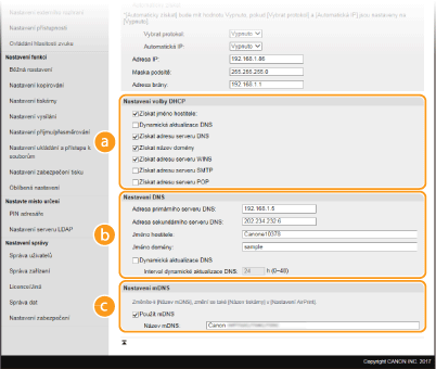 mDNS (multicast DNS) je protokol přijatý službou Bonjour, který slouží k přiřazení názvu hostitele k adrese IP bez použití systému DNS. Chcete-li funkci mDNS povolit, zaškrtněte políčko a zadejte název mDNS do textového pole [Název mDNS]. |