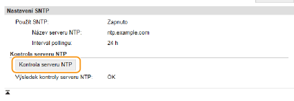 [Nastavení sítě] [Kontrola serveru NTP] v části [Nastavení SNTP]. Pokud bylo vytvořeno funkční připojení, výsledek se zobrazí v následující podobě. Upozorňujeme, že touto operací se neupraví systémové hodiny.