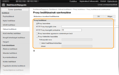 Ha engedélyezve van a proxyhitelesítés, akkor az ehhez szükséges jelszó beállításához vagy módosításához be kell jelölnie a jelölőnégyzetet, majd a [Jelszó] szövegmezőben meg kell adnia az új, alfanumerikus karakterekből álló jelszót.