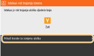Ako se poruka prikaže kada uređaj prima faks ili je postavljen automatski ispis izvješća, primljeni faksovi/I-faksovi i izvješća pohranit će se u memoriji da pri ispisu ne bi bili blijedi. Da biste nastavili ispisivati čak i ako je razina tonera u spremniku niska, opciju <Nastavite s ispisom. T. nis.> postavite na <Uključ.>. <Nastavite s ispisom. T. nis.>