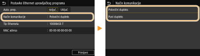Naizmjenično šalje i prima podatke za komunikaciju. Odaberite kada je uređaj povezan s mrežnim uređajem putem naizmjeničnog dvosmjernog načina komunikacije. <Puni dupleks>