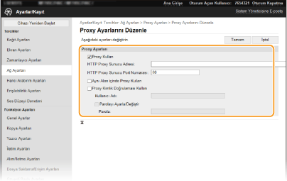 Proxy sunucusu tarafından kimlik doğrulamasını etkinleştirmek için onay kutusunu seçin ve [Kullanıcı Adı] metin kutusuna kullanıcı adı için alfasayısal karakter girin.