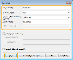 اضبط وضع الاتصال ورقم الفاكس (أو URI)، وانقر فوق [موافق].