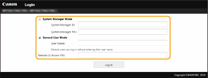 حدد [System Manager Mode] (وضع مدير النظام) أو [General User Mode] (وضع المستخدم العام), وأدخل قيمة في [Remote UI Access PIN] (رمز مرور PIN واجهة المستخدم عن بعد) عند الضرورة.