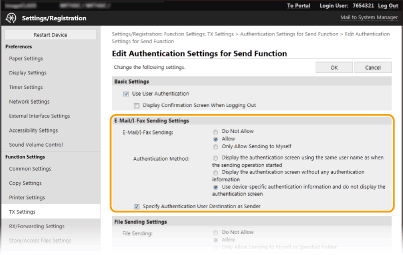 [Authentication Settings for Send Function] (إعدادات المصادقة لوظيفة الإرسال).