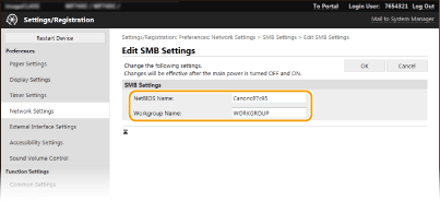 Server Message Block (SMB) هو بروتوكول لمشاركة الموارد، مثل الملفات والطابعات، مع أكثر من جهاز واحد في شبكة ما. يستخدم الجهاز SMB لتخزين المستندات الممسوحة ضوئيًّا في مجلد مشترك. قد تحتاج إلى إعداد اسم NetBIOS واسم مجموعة العمل، وذلك تبعًا لشبكتك.