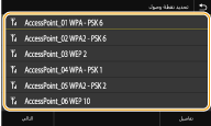 يمكنك البحث عن الموجهات اللاسلكية (أو نقاط الوصول) المتاحة للاتصال وتحديد واحد منها من شاشة الجهاز. فيما يتعلق بمفتاح الشبكة، أدخل مفتاح WEP أو PSK. قبل تحديد موجه لاسلكي، تحقق من معلومات الإعداد المطلوبة وقم بتدوينها، بما في ذلك مفتاح SSID ومفتاح الشبكة (