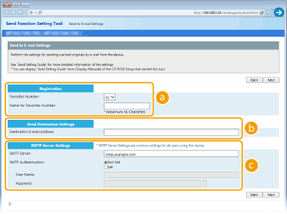 تساعدك أداة Send Function Setting Tool (أداة ضبط وظيفة الإرسال) في تكوين الإعدادات الأساسية لإرسال رسائل البريد الإلكتروني. وعوضًا عن أداة Send Function Setting Tool (أداة ضبط وظيفة الإرسال)، يمكنك استخدام واجهة المستخدم عن بعد في تكوين إعدادات أكثر تفصيلاً مثل إعدادات مصادقة POP قبل الإرسال أو الخاصة بالاتصالات المشفرة. تكوين إعدادات اتصالات البريد الإلكتروني/فاكس الإنترنت