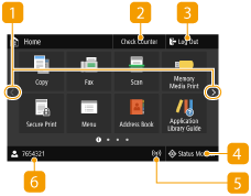 на панелі керування. Цей екран призначено для вибору параметрів і реєстрації функцій.![]() | Змінення сторінкиВикористовуйте цю кнопку для перегляду іншої сторінки на екрані Home. Для переходу до наступної сторінки можна також гортати по дисплею вбік. <Check Counter>Відобразиться загальний обсяг роздруківок. Перегляд значення лічильника <Log Out>Натисніть цю кнопку, щоб вийти із системи апарата. <Status Monitor>Натисніть цю клавішу, щоб перевірити стан друку, переглянути журнал використання апарата й параметри мережі, зокрема IP-адресу апарата. Можна також перевірити стан апарата, наприклад, залишок паперу й тонера в картриджі, або наявність помилок. Екран <Status Monitor> Піктограма Wi-FiВідображається, коли апарат підключено до бездротової локальної мережі. Ім’я користувача/IDВідображається ім’я чи ID користувача в системі. |
