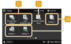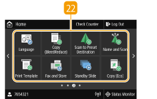 ![]() | <uniFLOW Online Setup>Можна перевірити стан використання пристрою та користувача, якщо підключитися до хмарної служби. Додаткову інформацію можна отримати на веб-сайті Canon. Кнопки швидкого доступуЦі кнопки відображають «Пріоритетні параметри», зареєстровані для функцій копіювання, факсу та сканування. Додавання кнопок на екран Home |