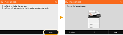 У деяких випадках у разі виникнення помилок на екрані відображаються інструкції з їх усунення. Для вирішення проблеми дотримуйтесь інструкцій, що з’являться на екрані. Нижче для прикладу наведено зображення екрана, який відображається, коли сталося зминання паперу.