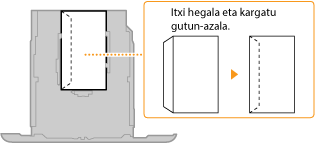 Atal honetan gutun-azalak nahi duzun orientazioarekin nola kargatu behar diren azaltzen da, eta gutun-azalak kargatu baino lehen jarraitu beharreko prozedurak ere bai. Gutun-azalak paper-tiraderan edo erabilera anitzeko erretiluan kargatzeko prozedura orokorraren deskribapen bat jasotzeko, ikusi Papera paper-tiraderan kargatzea edo Papera erabilera anitzeko erretiluan kargatzea.