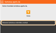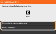 Mezua makina fax/I-Fax bat jasotzen ari denean edo txostenen inprimatze automatikoa ezarrita dagoenean bistaratzen bada, jasotako faxak/I-Faxak eta txostenak memorian gordeko dira, behin inprimatuta motelduta ager ez daitezen. Toner-kartutxoan geratzen den kantitatea agortzen ari bada ere inprimatzen jarraitzeko, ezarri <Jarr. inpr. ia hutsik badago.> hona: <Aktibatuta>. <Jarr. inpr. ia hutsik badago.>
