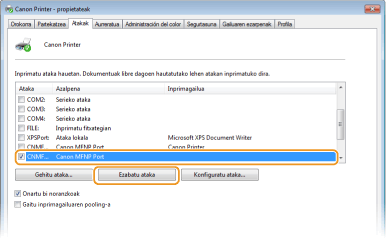 Ezin duzu ataka bat ezabatu, hau inprimagailuaren ataka gisa konfiguratuta badago. Ataka hori ezabatzeko, hautatu beste ataka bat eta sakatu [Apply] inprimagailuaren ataka berri gisa konfiguratzeko; eta gero, ezabatu nahi zenuen ataka ezabatu.