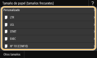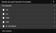 Si la pantalla anterior no aparece cuando hay papel cargadoSi siempre carga el mismo papel en la bandeja multiuso, puede omitir las operaciones de configuración del papel registrando el tamaño y el tipo de papel como opción predeterminada. Sin embargo, si se registra la opción predeterminada, la pantalla anterior no aparecerá. Para visualizar la pantalla, seleccione <Especificar cuando cargue papel> (Registro de las opciones de papel predeterminadas para la bandeja multiuso). |