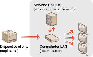 El equipo puede conectarse a una red 802.1X como dispositivo cliente. Una red 802.1X normal está formada por un servidor RADIUS (servidor de autenticación), un conmutador LAN (autenticador) y dispositivos cliente con software de autenticación (suplicantes). Si un dispositivo intenta conectarse a la red 802.1X, el dispositivo deberá autenticar al usuario para demostrar que la conexión pertenece a un usuario autorizado. La información de autenticación se envía y se comprueba a través de un servidor RADIUS, que permite o rechaza la comunicación con la red en función del resultado de la autenticación. Si en la autenticación no se obtienen los resultados esperados, un conmutador LAN (o un punto de acceso) bloquea el acceso desde el exterior de la red.