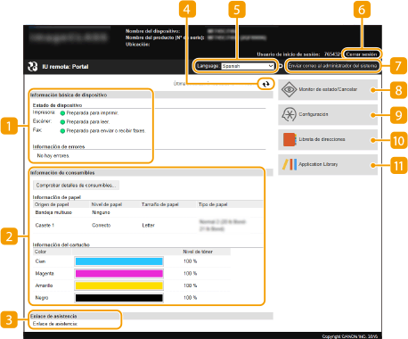 Al iniciar sesión en la IU remota aparece la siguiente página del Portal. En esta sección se describen los elementos que aparecen en la página del Portal y las operaciones básicas.