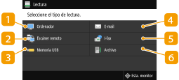 Al seleccionar <Lectura> en la pantalla Inicio, se muestra la pantalla de Funciones básicas de escaneado.