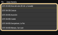 Configure <Zona horaria> antes de configurar la fecha y la hora actuales. Si la opción <Zona horaria> se modifica más tarde, la fecha y la hora actuales también se modificarán.