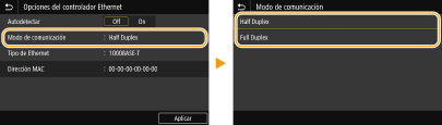 Envía y recibe datos de comunicación de forma alterna. Seleccione cuándo se conecta el equipo a un dispositivo de red utilizando Half Duplex.