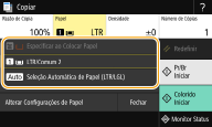 Quando o cassette feeding module opcional está instalado, sua gaveta de papel também é exibida. <Seleção Automática de Papel (LTR/LGL)> pode não ser exibido, dependendo do modelo que estiver utilizando. <Seleção Automática de Papel (LTR/LGL)> não fica disponível quando não há documento carregado no alimentador. <Seleção Automática de Papel (LTR/LGL)> não fica disponível quando as opções <N em 1>, <Apagar Moldura> ou <Cópia do Cartão ID> são usadas. |