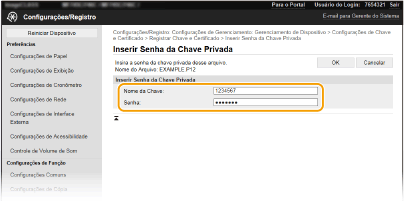 2 | Insira o nome da chave e senha. [Nome da Chave] Digite os caracteres alfanuméricos para o nome de chave a ser registrado. [Senha] Digite os caracteres alfanuméricos para a senha do conjunto de chave privada do arquivo a ser registrado. |
