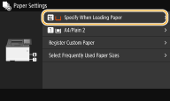 After the default paper setting is registered, the paper setting screen is not displayed when paper is loaded, and the same setting is always used. If you load a different paper size or type without changing the paper settings, the machine may not print properly. To avoid this problem, select <Specify When Loading Paper> in step 3, and then load the paper. |