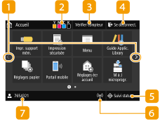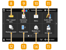 ![]() | <Impr. support mém.>Imprime des fichiers stockés sur un périphérique mémoire USB. Impression depuis un périphérique mémoire USB (impression support mémoire) <Impression sécurisée>Utilisez cette fonction pour imprimer un document sécurisé. Impr. d'un document sécurisé par un code PIN (Impression sécurisée) <Menu><Réglages des fonctions>, <Préférences> et de nombreux autres réglages de l'appareil sont accessibles depuis ce bouton. Liste du menu des réglages Bouton Application Library (Bibliothèque d'applications)Vous pouvez utiliser ces bouton pour simplifier l'exécution d'une fonction par une opération 1 touche. Pour plus d'informations, consultez le manuel d'Application Library (Bibliothèque d'applications) sur le site Web des manuels en ligne. <Réglages papier>Ce bouton permet de spécifier le format et le type du papier chargé dans la cassette à papier et le bac multifonctions. Spécification du format et du type de papier <Portail mobile>Utilisez ce bouton pour établir une connexion avec un appareil mobile. Connexion à des terminaux mobiles |