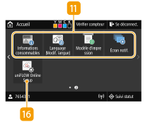 ![]() | <Réglages écr accueil>Permet de changer l'ordre d'affichage des boutons de l'écran Accueil. Personnalisation de l'écran Accueil <M à J microprogramme>Permet de mettre à jour le microprogramme via l'Internet. Mise à jour du microprogramme <uniFLOW Online Setup>Vous pouvez vérifier l'état d'utilisation de l'appareil et l'utilisateur en établissant une connexion au service sur le Cloud. |
