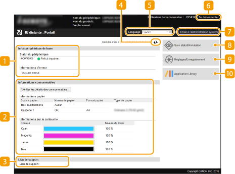 Affiche l'état actuel de l'appareil et les informations d'erreur. En cas d'erreur, le lien vers la page Informations d'erreur apparaît.