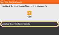 Questo messaggio comunica all'utente che sarà presto necessario sostituire una cartuccia del toner. Assicurarsi di disporre di una cartuccia del toner sostitutiva. Sostituire la cartuccia del toner se compare questo messaggio prima di iniziare un lavoro di stampa molto lungo. Compare quando <Azione per avviso> è impostato su <Interrompi stampa> (