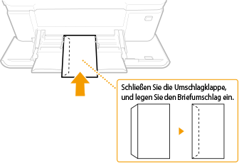 In diesem Abschnitt wird beschrieben, wie Sie Briefumschläge in der gewünschten Ausrichtung einlegen und welche Schritte Sie vor dem Einlegen von Briefumschlägen ausführen müssen. Eine Beschreibung der allgemeinen Schritte zum Einlegen von Briefumschlägen in die Papierkassette oder das Mehrzweckfach finden Sie unter Einlegen von Papier in die Papierkassette oder Einlegen von Papier in das Mehrzweckfach. |