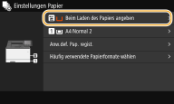Nach dem Speichern der Standardpapiereinstellungen wird der Bildschirm zum Einstellen des Papiers beim Einlegen von Papier nicht mehr angezeigt, und es wird immer dieselbe Einstellung verwendet. Wenn Sie Papier in einem anderen Format oder eines anderen Typs einlegen, ohne die Papiereinstellungen zu ändern, druckt das Gerät möglicherweise nicht einwandfrei. Um dieses Problem zu vermeiden, wählen Sie <Beim Laden des Papiers angeben> in Schritt 3, und legen Sie dann das Papier ein. |