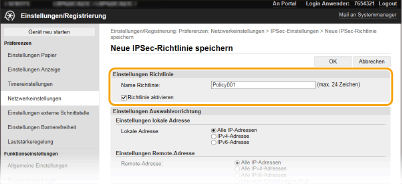 Wenn Sie für [Remote-Adresse] die Einstellung [Manuelle Einstellungen IPv4] oder [Manuelle Einstellungen IPv6] gewählt haben, geben Sie die IP-Adresse ein, auf die die Richtlinie angewendet werden soll. Sie können auch einen Adressbereich eingeben, indem Sie zwischen den Adressen einen Bindestrich einfügen.