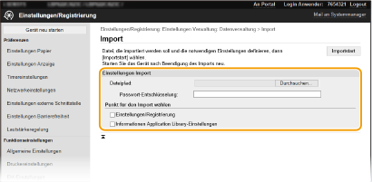 Geben Sie das Passwort ein, das beim Export der Einstellungen festgelegt wurde.