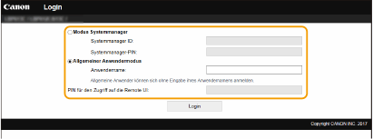 Sie können alle Remote UI-Vorgänge und -Einstellungen durchführen. Geben Sie die entsprechende ID unter [Systemmanager ID] und die PIN unter [Systemmanager-PIN] ein.