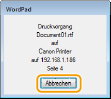 Abbrechen über Remote UIAbbrechen über eine AnwendungBei einigen Anwendungen wird ein Bildschirm wie der folgende angezeigt. Sie können den Druckvorgang abbrechen, indem Sie auf [Abbrechen] klicken.