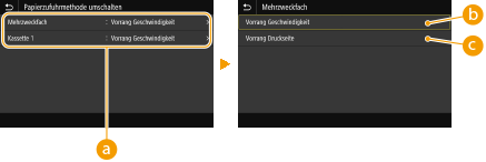 <Mehrzweckfach> <Vorrang Geschwindigkeit>  <Vorrang Druckseite> <Kassette 1> <Vorrang Geschwindigkeit>  <Vorrang Druckseite> <Kassette 2>* <Vorrang Geschwindigkeit>  <Vorrang Druckseite> |