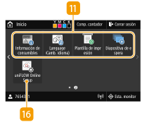 en el panel de control. Utilice esta pantalla para especificar la configuración y registrar funciones.![]() | Cambiar de páginaUtilícelo para ver otra página de la pantalla Inicio. También puede deslizar el dedo lateralmente para cambiar de página. Cantidad restante de tóner en los cartuchosMuestra la cantidad de tóner restante en los cartuchos por fases. <Comp. contador>Muestra el número total de impresiones en blanco y negro y en color por separado. Visualización del valor del contador <Cerrar sesión>Utilice este botón para cerrar la sesión en el equipo. <Esta. monitor>Púlsela para consultar el estado de impresión, para ver el historial de uso o para ver las opciones de red, como puede ser la dirección IP del equipo. Asimismo, podrá consultar el estado del equipo, como por ejemplo, la cantidad restante de papel y la cantidad de tóner restante en los cartuchos, o si se ha producido algún error. Pantalla <Monitor de estado> Icono Wi-FiAparece cuando el equipo está conectado a una LAN inalámbrica. Nombre de usuario/IDSe muestra el nombre o ID del usuario que ha iniciado sesión. |