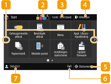 te drukken. Via dit scherm kunt u instellingen opgeven en functies registreren.![]() | Een andere pagina kiezenKies hiermee een andere pagina in het Home-scherm. U kunt ook zijdelings strijken om van pagina te wisselen. Resterende hoeveelheid toner in de cartridgesGeeft in stappen aan hoeveel toner er nog in de cartridges zit. <Contr. tellerstand>Geeft de totalen voor zwart-witafdrukken en kleurenafdrukken afzonderlijk weer. Aantal afdrukken weergeven <Afmelden>Met deze knop kunt u uitloggen bij het apparaat. <Statusmonitor>Druk hierop om de afdrukstatus te zien, om de gebruiksgeschiedenis te zien of om de netwerkinstellingen zoals het IP-adres van het apparaat te bekijken. Met deze toets kunt u ook de status van het apparaat controleren, zoals de resterende hoeveelheid papier en de resterende inhoud van de tonercartridges, en kijken of er fouten zijn opgetreden. Het scherm <Statusmonitor> Wi-Fi pictogramVerschijnt als het apparaat is verbonden met een draadloos LAN. Gebruikersnaam/IDDe naam of ID van de ingelogde gebruiker wordt weergegeven. |