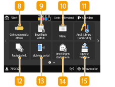 ![]() | <Geheugenmedia afdruk>Druk bestanden af die op een USB-geheugenapparaat zijn opgeslagen. Afdrukken vanaf een USB-geheugenapparaat (afdrukken via geheugenmedia) <Beveiligde afdruk>Met behulp van deze functie drukt u een beveiligd document af. Een met pincode beveiligd document afdrukken (Beveiligde afdruk) <Menu><Functie-instellingen>, <Voorkeuren>, en vele andere instellingen van het apparaat zijn toegankelijk met deze knop. Overzicht van menuopties Knop Application Library (Toepassingenbibliotheek)U kunt deze knoppen gebruiken om functies gemakkelijk te gebruiken via één-toetsbediening. Voor meer informatie raadpleegt u de handleidingen voor de Application Library (Toepassingenbibliotheek) op de website met handleidingen. <Papierinstell.>Met deze knop kunt u het formaat en type papier opgeven dat is geladen in de papierlade en multifunctionele invoer. Het type en formaat papier opgeven <Mobiele portal>Breng hiermee een verbinding met een mobiel toestel tot stand. Verbinden met mobiele apparaten |