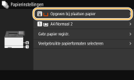 Als u standaard-papierinstellingen hebt opgegeven, wordt het scherm met papierinstellingen niet meer weergegeven wanneer u papier laadt. U gebruikt dan altijd dezelfde instellingen. Als u papier van een ander formaat of type plaatst zonder de papierinstellingen aan te passen, wordt er mogelijk niet goed afgedrukt. U kunt dit probleem voorkomen door <Opgeven bij plaatsen papier> in stap 3 te selecteren en dan pas het papier te laden. |