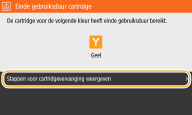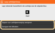 Dit bericht betekent dat de tonercartridge met de aangegeven kleur binnenkort moet worden vervangen. Zorg dat u beschikt over een nieuwe tonercartridge. Vervang de tonercartridge als u dit bericht ziet net voordat u een grote taak wilt gaan afdrukken. Dit verschijnt als <Actie bij waarschuwing> is ingesteld op <Afdrukken stoppen> (