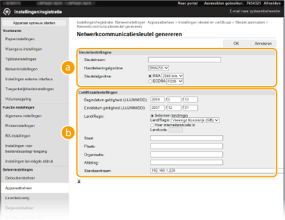 U kunt een sleutel en certificaat genereren met het apparaat als dit nodig is voor gecodeerde communicatie via Transport Layer Security (TLS). U kunt TLS gebruiken voor toegang tot het apparaat via de externe UI. Zelf-ondertekende certificaten worden gebruikt bij de sleutel en certificaat die zijn gegenereerd in 'Netwerkcommunicatie'.