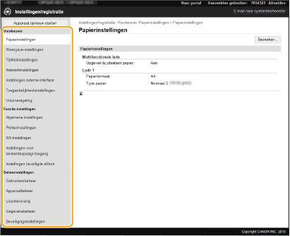 U kunt verschillende instellingen van de machine wijzigen met de externe UI. De meeste instellingen kunnen ook via het bedieningspaneel van de machine worden gewijzigd, maar sommige instellingen kunt u alleen wijzigen via de externe UI. Dit gedeelte beschrijft de basisprocedure voor het veranderen van de instelling van het apparaat met behulp van de externe UI.