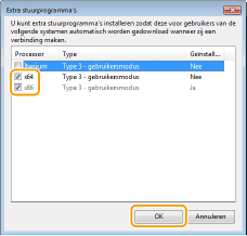 2 | Schakel het selectievakje in van de bitarchitectuur van andere computers en klik op [OK]. ![]() Selecteer extra stuurprogramma's uit de volgende opties in overeenstemming met het besturingssysteem van de afdrukserver.