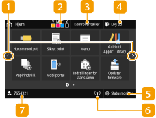 på kontrolpanelet. Brug denne skærm til at angive indstillinger for og registrere funktioner.![]() | Skift sideBrug denne funktion til at få vist en anden side på skærmen Hjem. Du kan også svirpe til siden for at skifte side. Mængde, der er tilbage i tonerpatronerneViser mængden af resterende toner i patronerne i intervaller. <Kontrollér tæller>Viser de separate totalværdier for udskrift i sort-hvid og farve. Visning af tællerværdien <Log ud>Brug denne knap til at logge ud fra maskinen. <Statusmonitor>Tryk for at kontrollere udskrivningsstatus, for at se brugshistorikken eller for at se netværksindstillinger som f.eks. maskinens IP-adresse. Du kan også tjekke maskinens status, f.eks. den resterende mængde papir eller den resterende mængde i tonerpatronerne, eller om der er opstået fejl. <Statusmonitor>-skærmen WiFi-ikonVises, når maskinen har forbindelse til et trådløst LAN. Brugernavn/IDNavn eller ID for den påloggede bruger vises. |