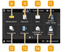 ![]() | <Hukom.med.prt.>Udskriver filer gemt på en USB-hukommelsesenhed. Udskrivning fra USB-hukommelse (hukommelsesmedieudskrivning) <Sikret print>Brug denne funktion til at udskrive et sikkert dokument. Udskr. et dok. sikret med en PIN-kode (sikret print) <Menu><Funktionsindstillinger>, <Præferencer> og mange andre maskinindstillinger starter med denne knap. Liste over menuen Indstilling Knappen Application Library (Programbibliotek)Du kan bruge disse knapper til at udføre praktiske funktioner ved hjælp af hurtigopkald. For mere information henvises til manualen om Application Library (Programbibliotek) på hjemmesiden med online-manualer. <Papirindstilli.>Denne knap bruges til at angive størrelsen og typen af papir, der er lagt i papirskuffen og universalbakken. Angivelse af papirformat og –type <Mobilportal>Brug denne til at etablere en forbindelse til en mobil enhed. Forbindelse til mobilenheder |