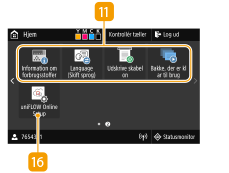 ![]() | <Indstillinger for Startskærm>Gør det muligt at ændre den rækkefølge, som Hjem-skærmknapperne vises i. Tilpasning af Hjem-skærmen <Opdater firmware>Gør det muligt at opdatere firmwaren via internettet. Opdatering af firmware <uniFLOW Online Setup>Du kan kontrollere enhedens og brugerens brugsstatus ved at etablere forbindelse til cloud-tjenesten. For mere information henvises til Canons websted. |