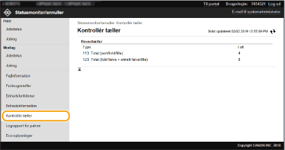Information om maskinen og systemadministratoren vises. Enhedsnavnet og andre af systemadministratorens informationer, der er vist her, svarer til indstillingerne i [Information om systemadministrator] på siden [Brugerstyring] eller i [Informationer om enhedsindstillinger] på siden [Enhedsstyring].